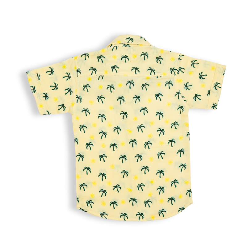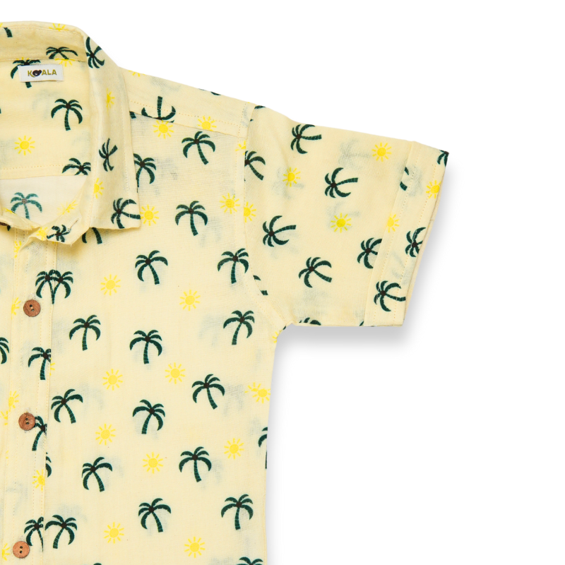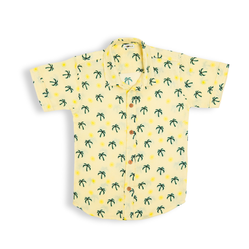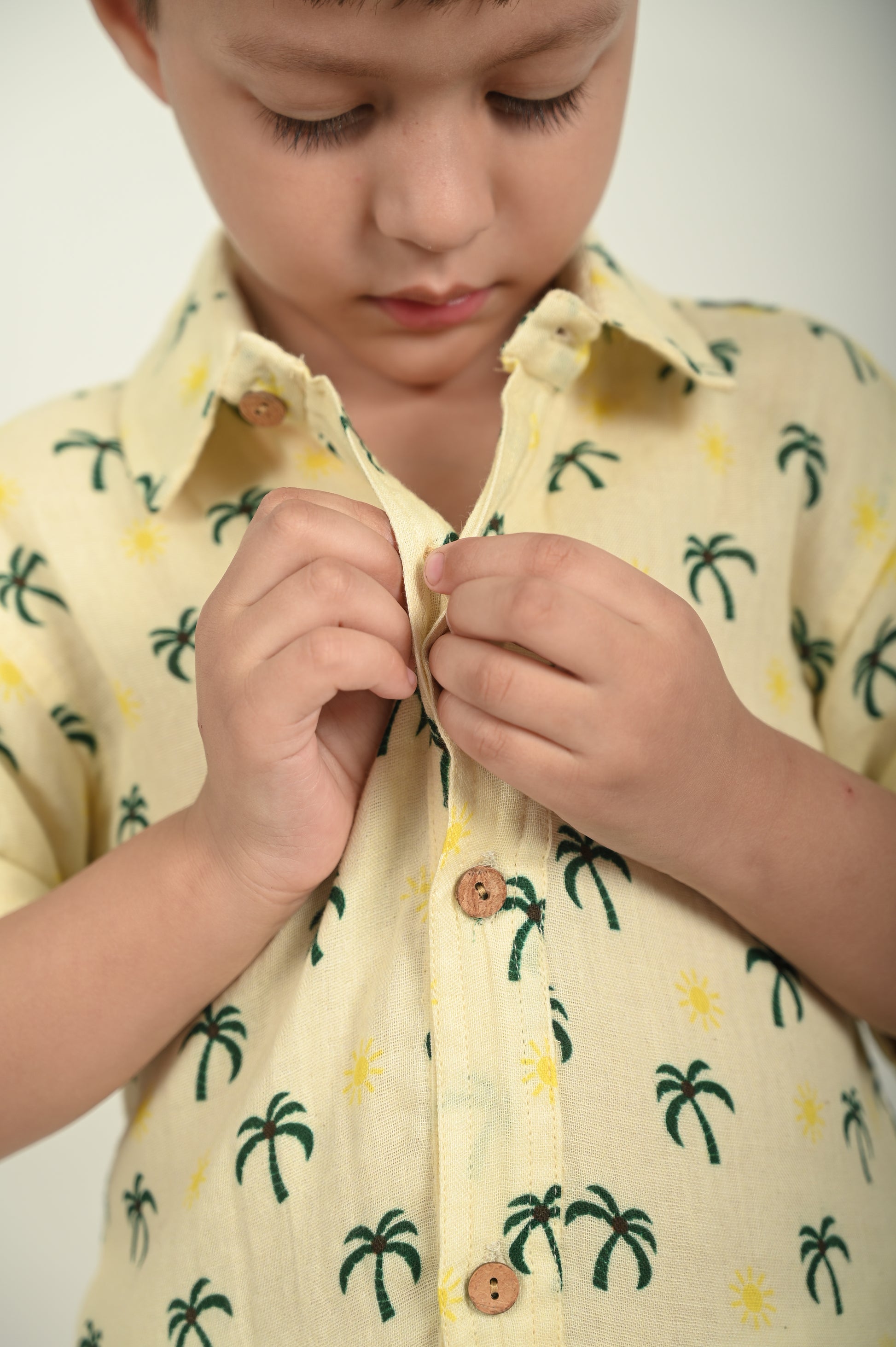 Made from 100% organic cotton, this cheerful yellow shirt features playful palm tree and sun embroidery. Wooden buttons and quality stitching ensure durability , eco-friendly outfit—perfect for casual outings, vacations, or festive occasions with all-day comfort.