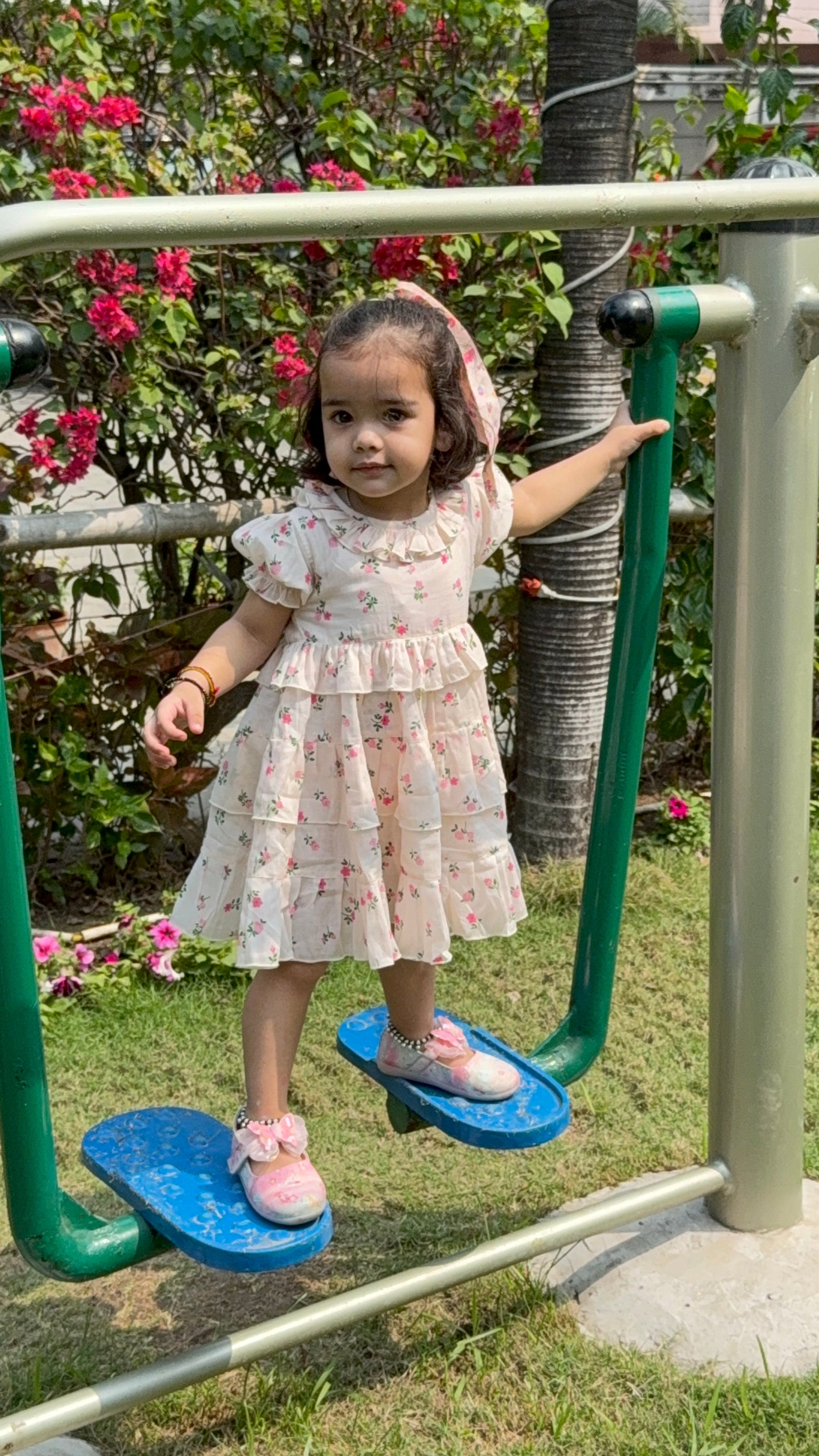 This charming muslin dress features a soft cream base with delicate pink floral prints and playful ruffle tiers for a classic, flowy silhouette. Wooden button closure at the back ensures easy wear, and a matching floral headband completes the look—perfect for warm-weather comfort and style.