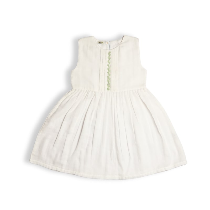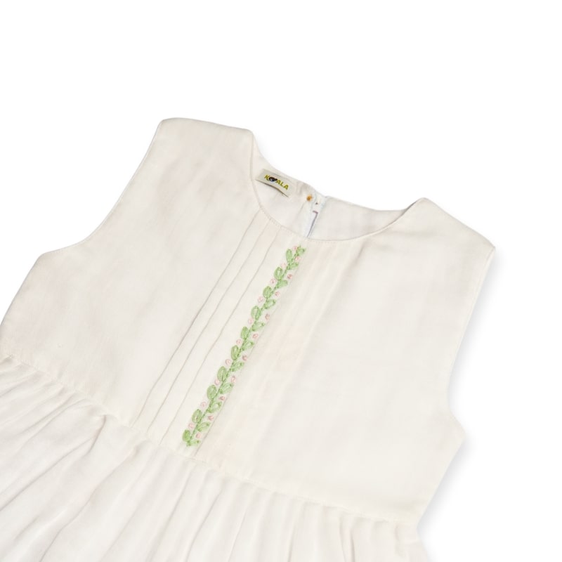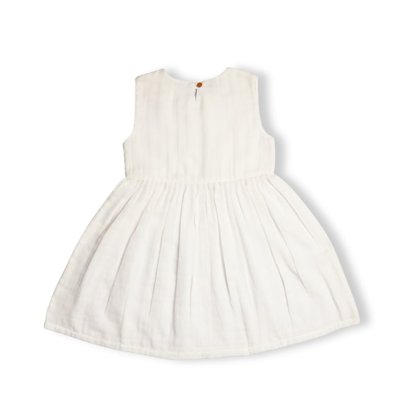 Graceful and airy, this sleeveless white muslin cotton dress features elegant pintuck detailing, delicate floral embroidery, and a beautifully flared silhouette. Made from lightweight, breathable fabric — it’s an ideal choice for sunny days, festive gatherings, or special celebrations.