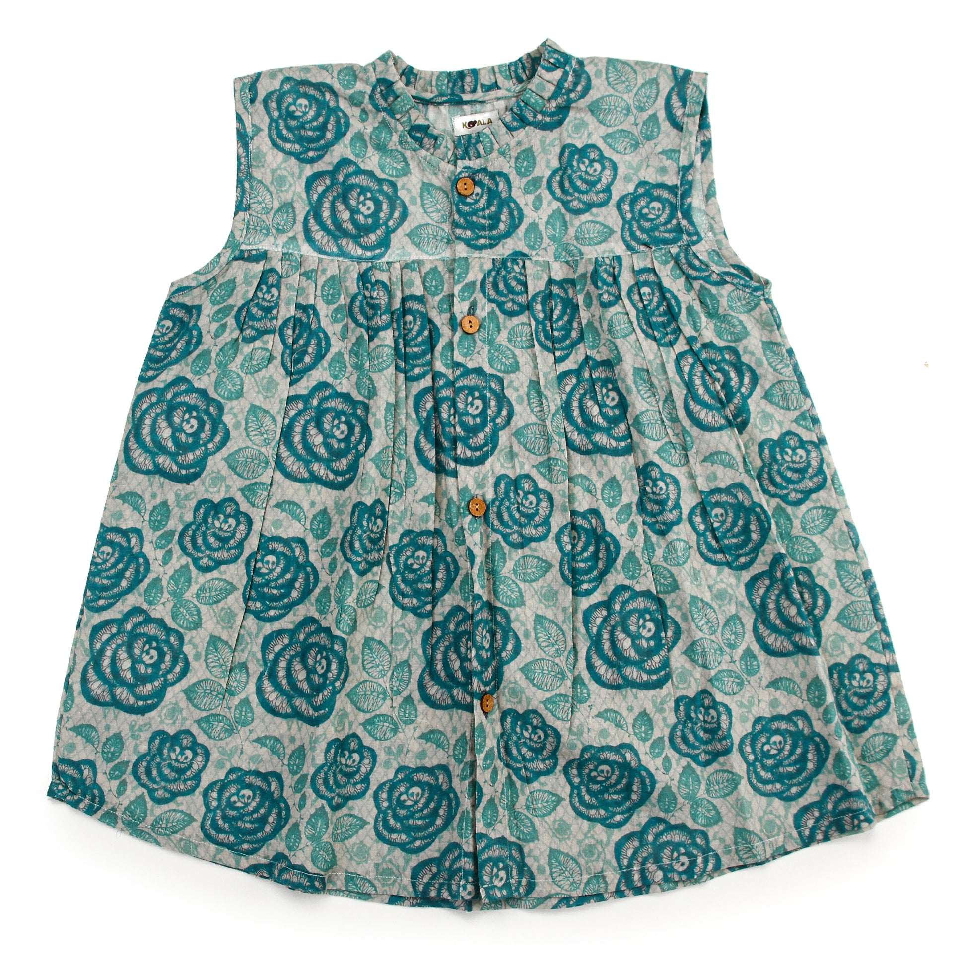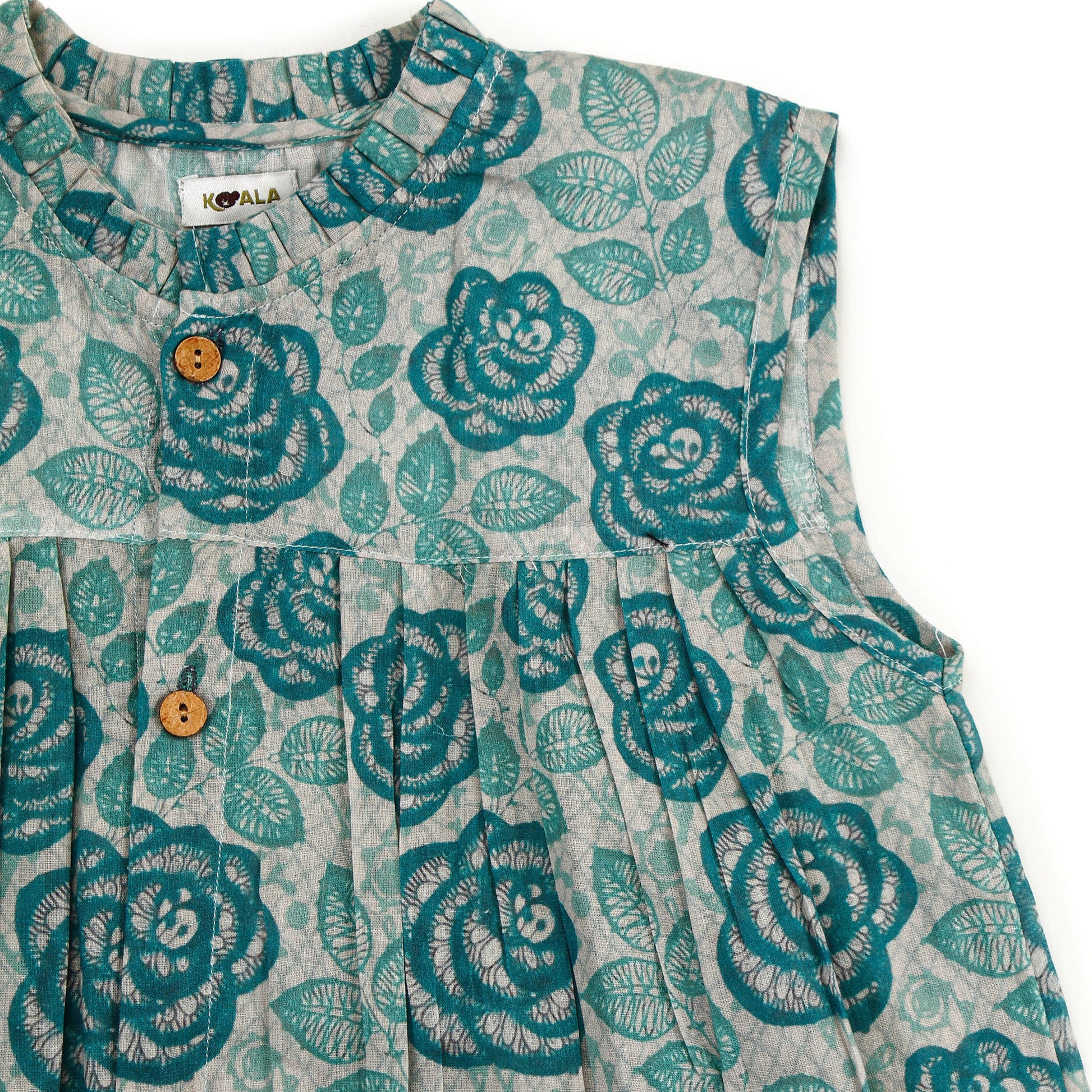 Crafted from soft organic cotton, this sleeveless front-open dress features hand-block floral prints in teal, wooden button detailing, and a round neckline. Lightweight and breezy — perfect for a playful yet elegant everyday look.