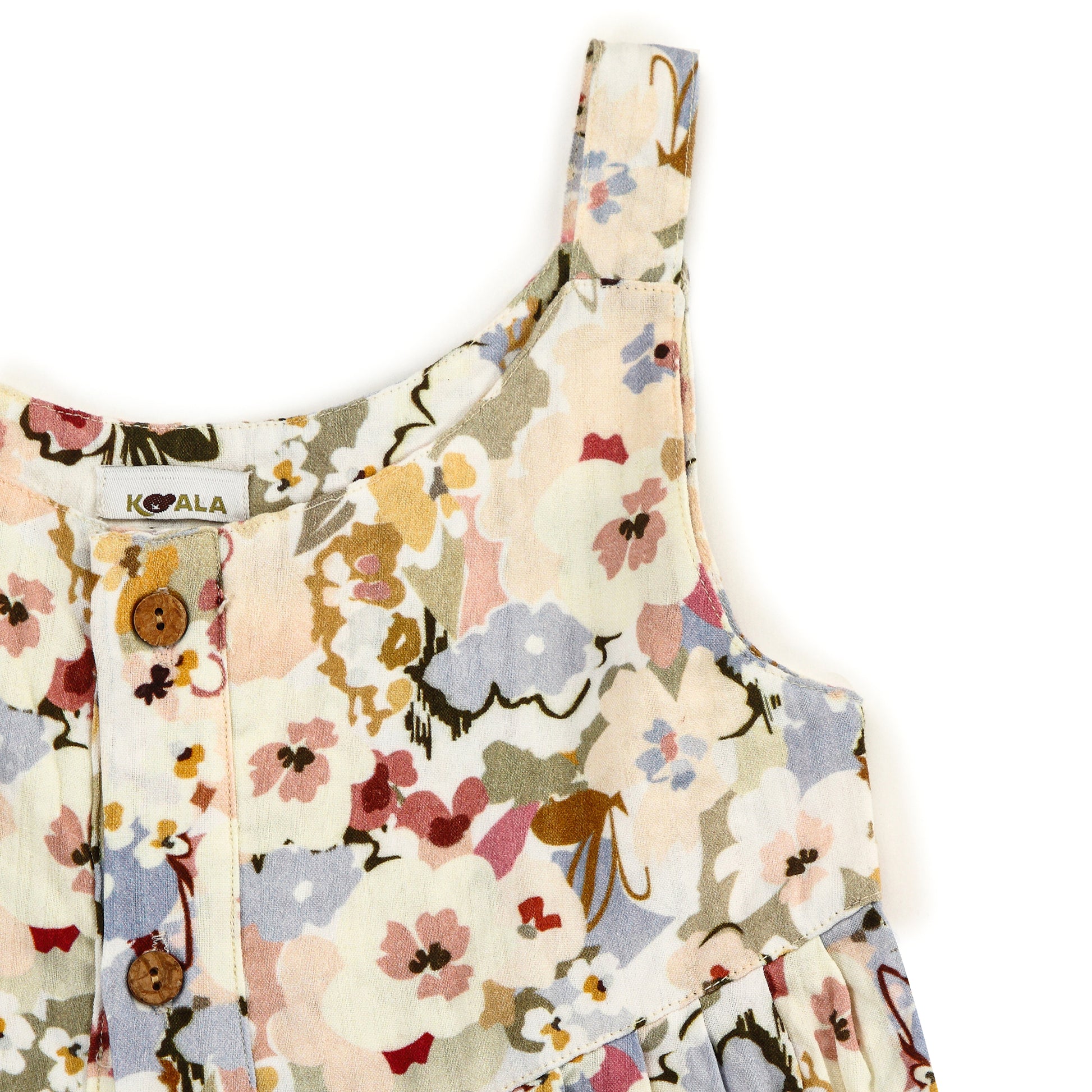 This sleeveless A-line sundress, crafted from breathable organic cotton, features a charming floral print in pastel shades. The dress is designed with wooden buttons down the front and soft pleats for a breezy, comfortable fit. Its flattering fit and vibrant pattern evoke the carefree feeling of a summer meadow.