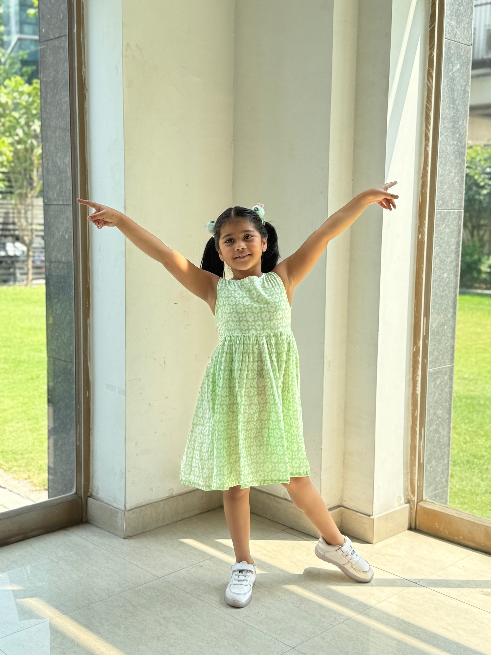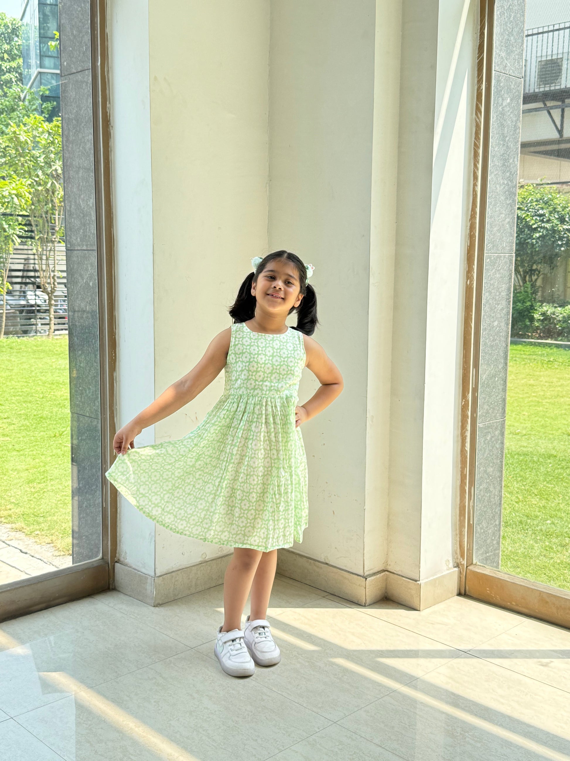 Twirl in this charming A-line dress, crafted from airy Mulmul fabric. The delicate digital floral print in refreshing light green and white keeps things playful and breezy, perfect for sunny days. A sleeveless design with a gathered waistline ensures comfort and style for every adventure.