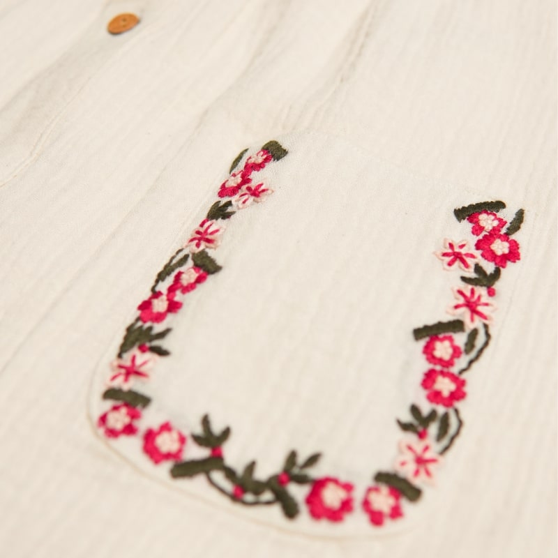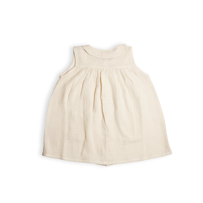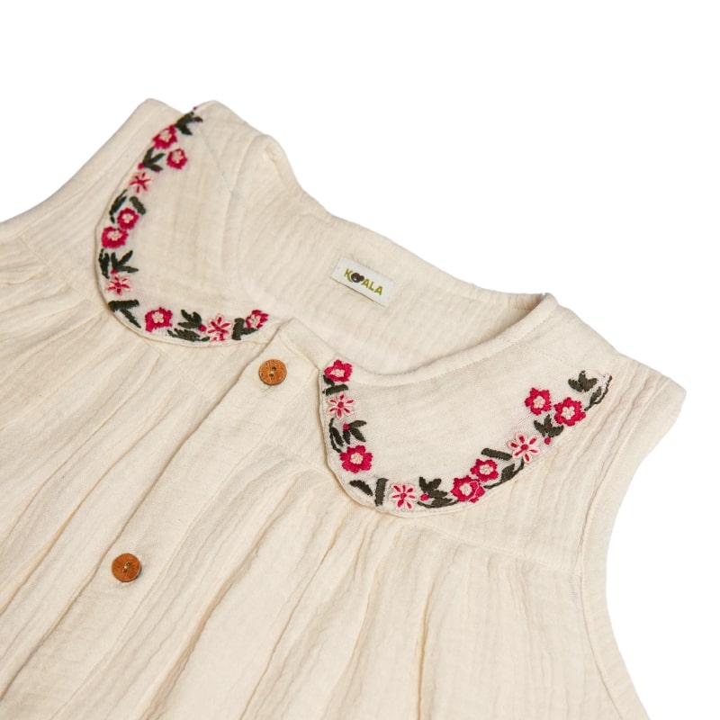 The Koala Organic Peter Pan Chic, a charming sleeveless dress crafted from 100% organic cotton. Featuring a shirt-style pattern with a Peter Pan collar, this dress is adorned with intricate hand embroidery on the collar and pockets, offering a perfect blend of colors for a chic and sophisticated look.