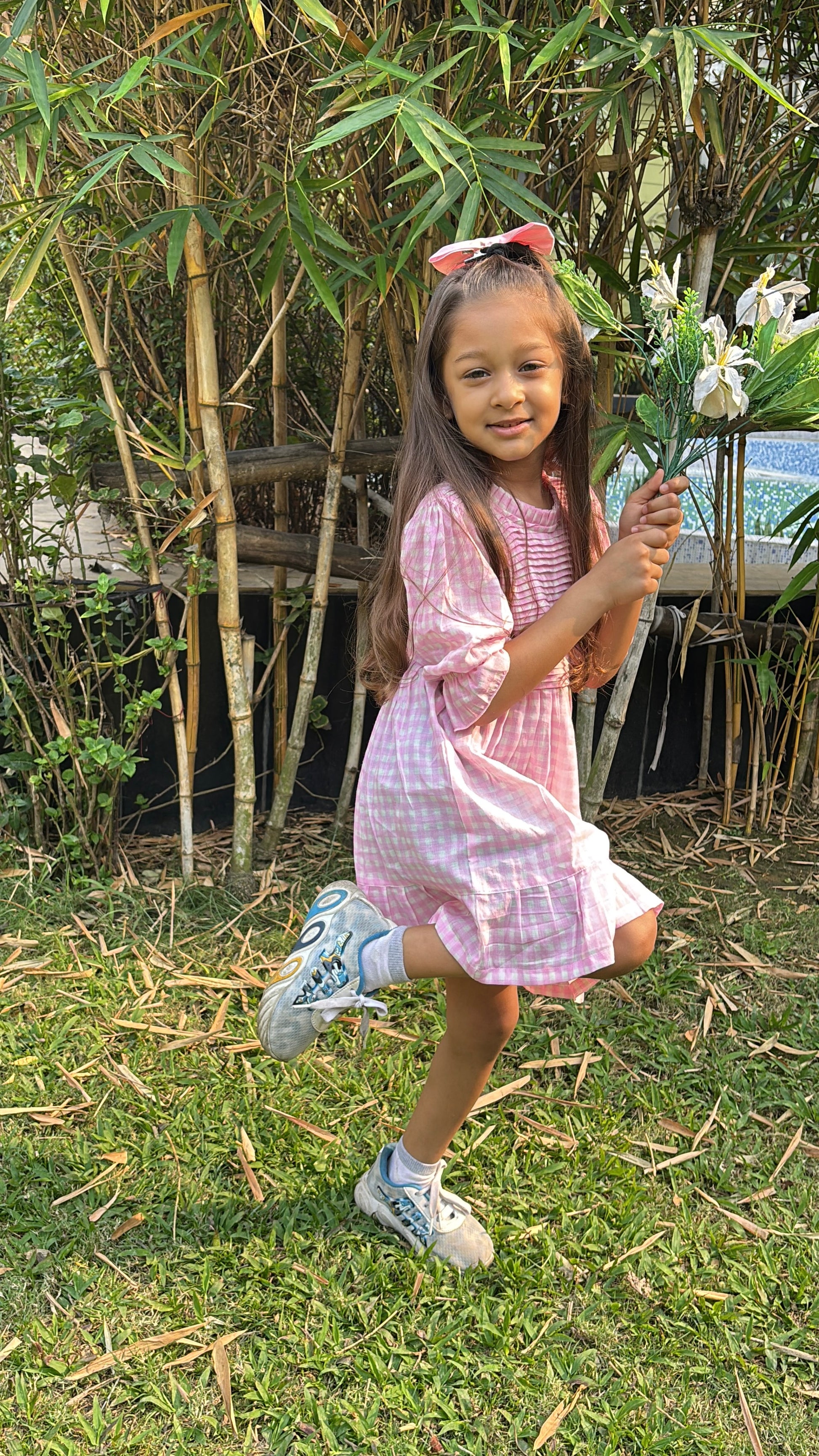 Made from soft, breathable muslin fabric, this lightweight dress is perfect for summer. It features a charming pink and white gingham check pattern, delicate pleats on the chest, ruffled sleeves, and a flared hemline for a playful, elegant look. Ideal for casual outings or special occasions, it offers both comfort and style.