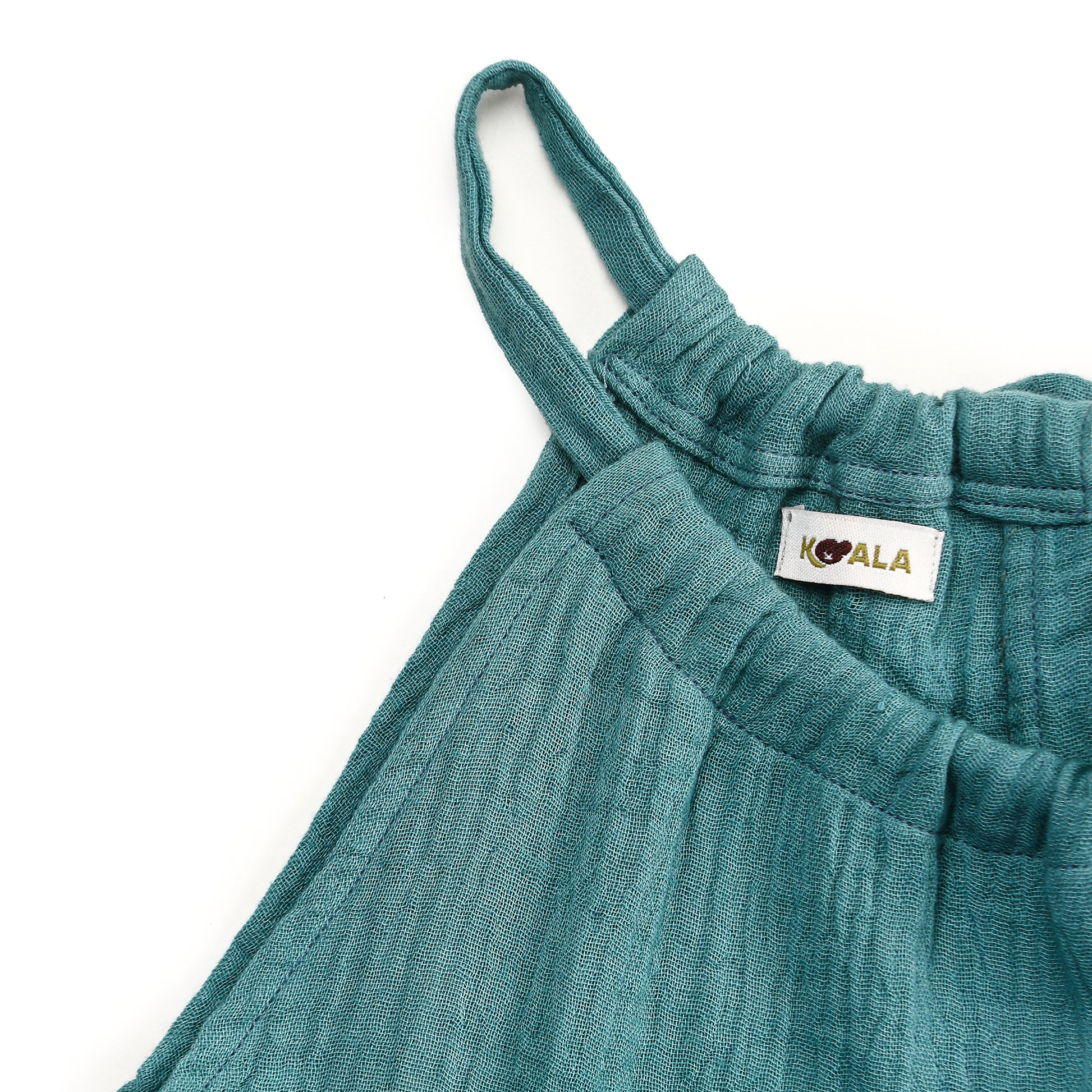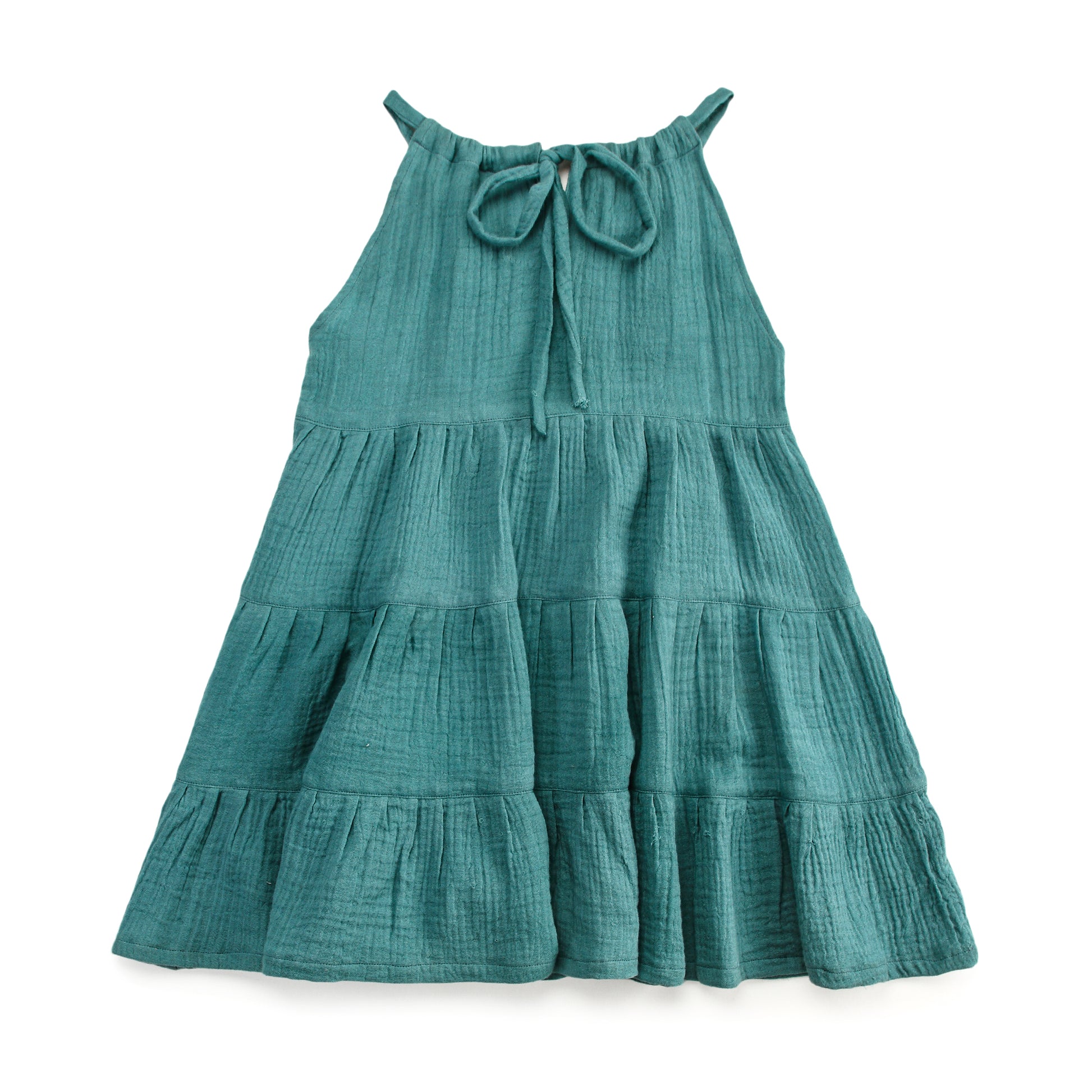 A tiered A-line dress in airy organic cotton, featuring a halter neckline and delicate ruffles. Its playful, flowy silhouette and charming design make it a true conversational piece—perfect for sunny outings and joyful playtime