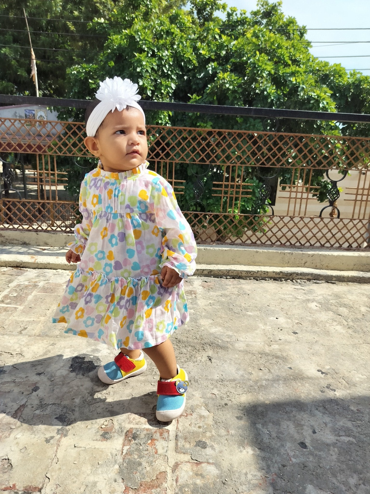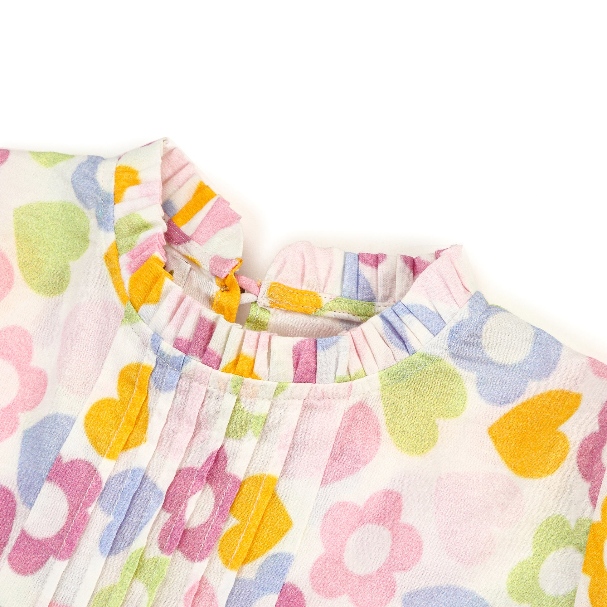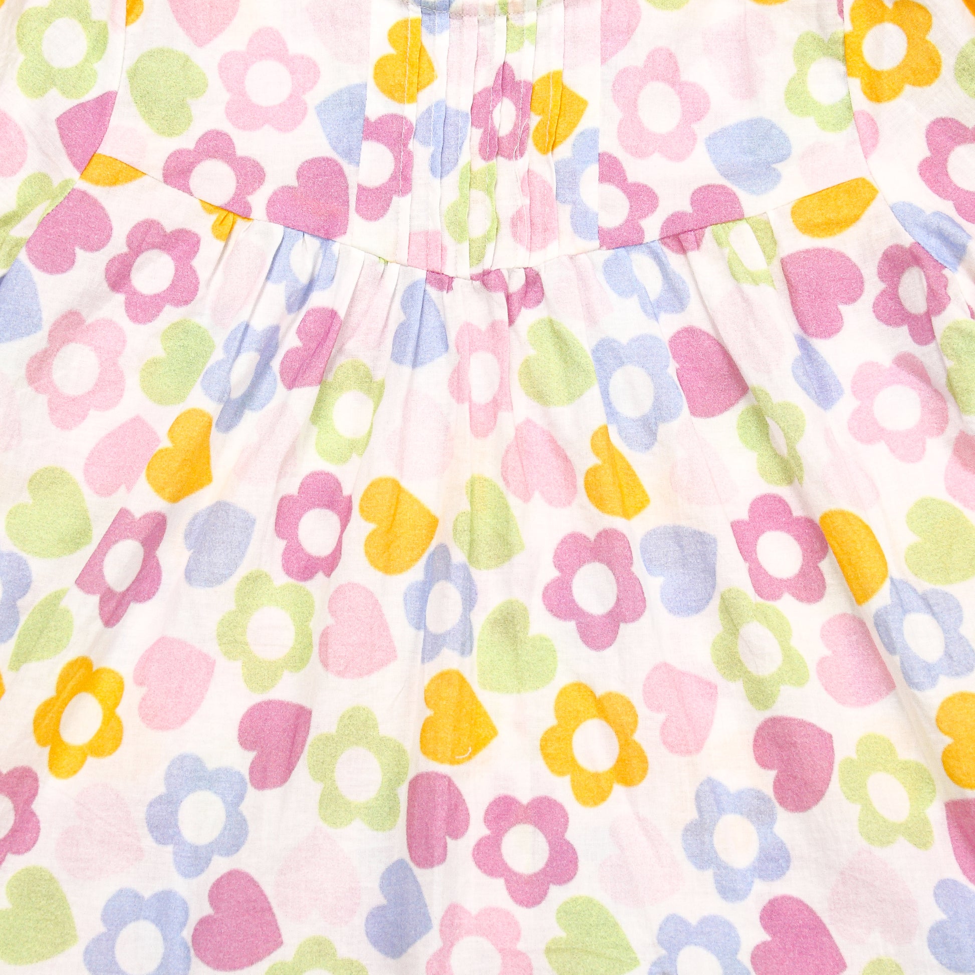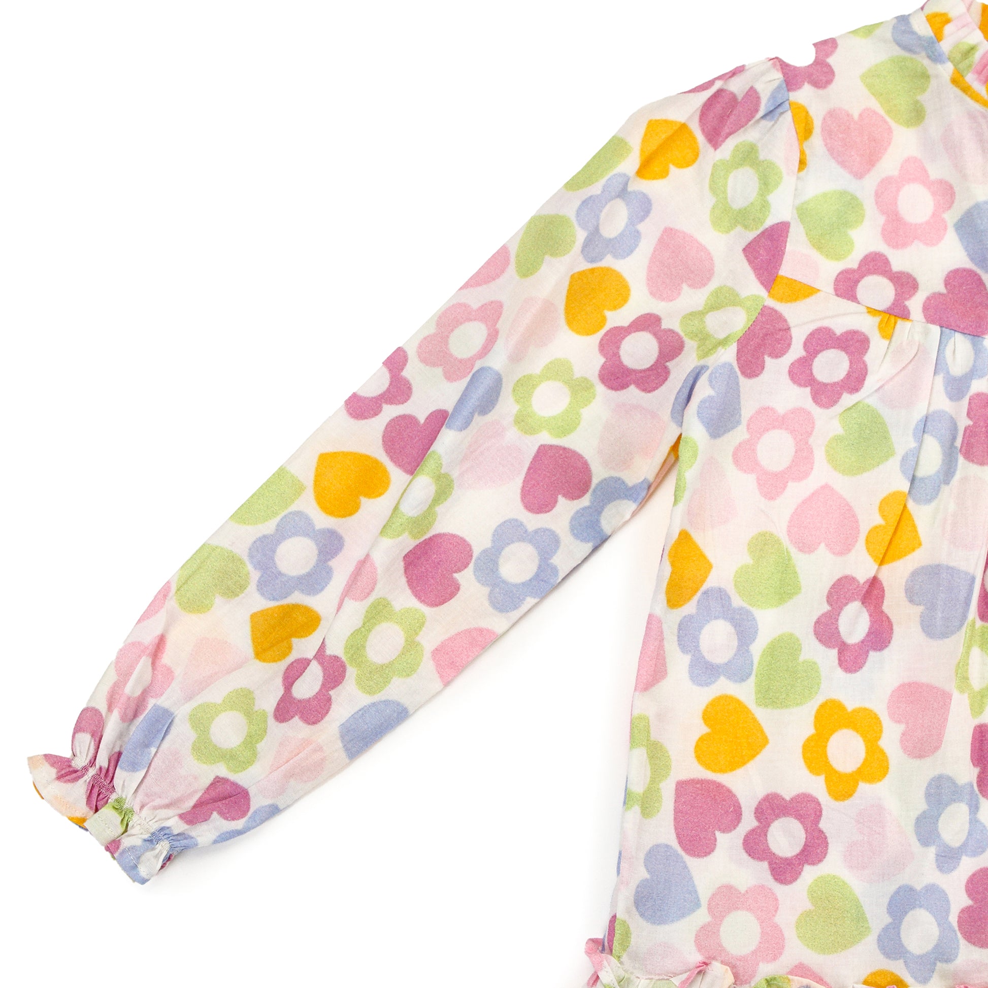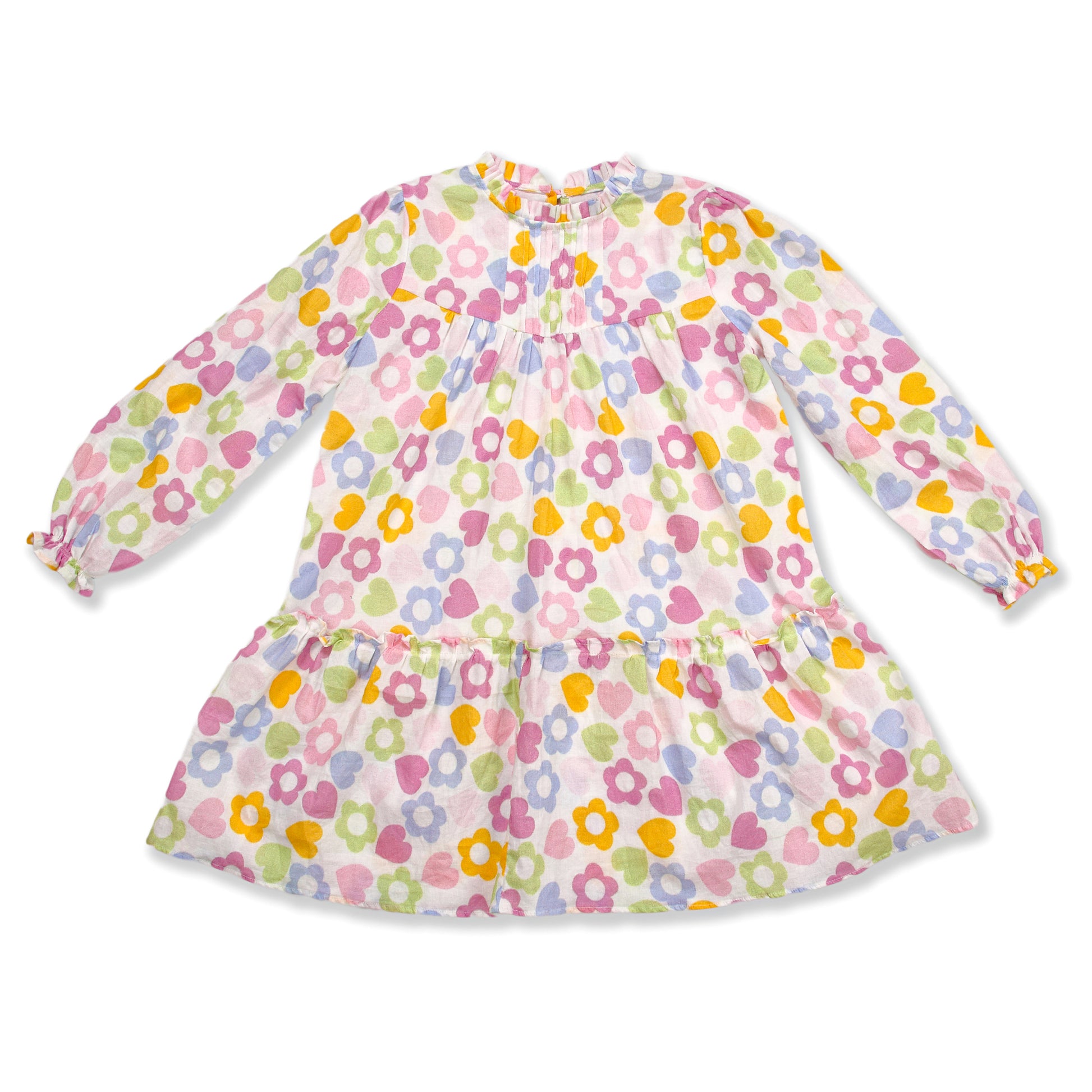 This charming dress features a vibrant pattern of colorful flowers and hearts in soft pastel shades. Crafted from 100% breathable cotton, it offers a lightweight, comfortable fit with long puffed sleeves, a tiered skirt, and delicate ruffled neckline—perfect for playdates, outings, or special moments.