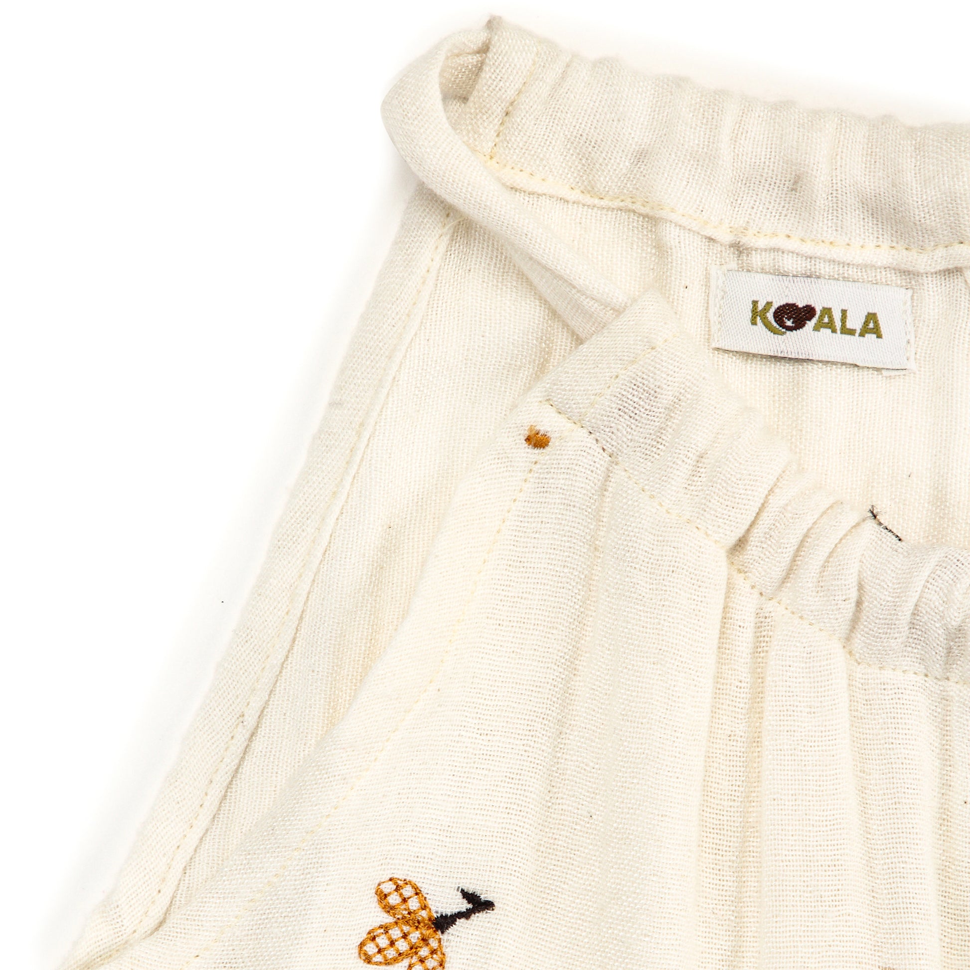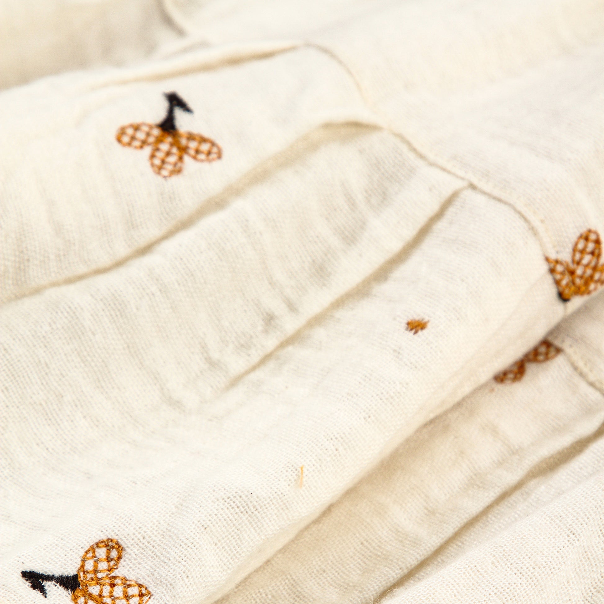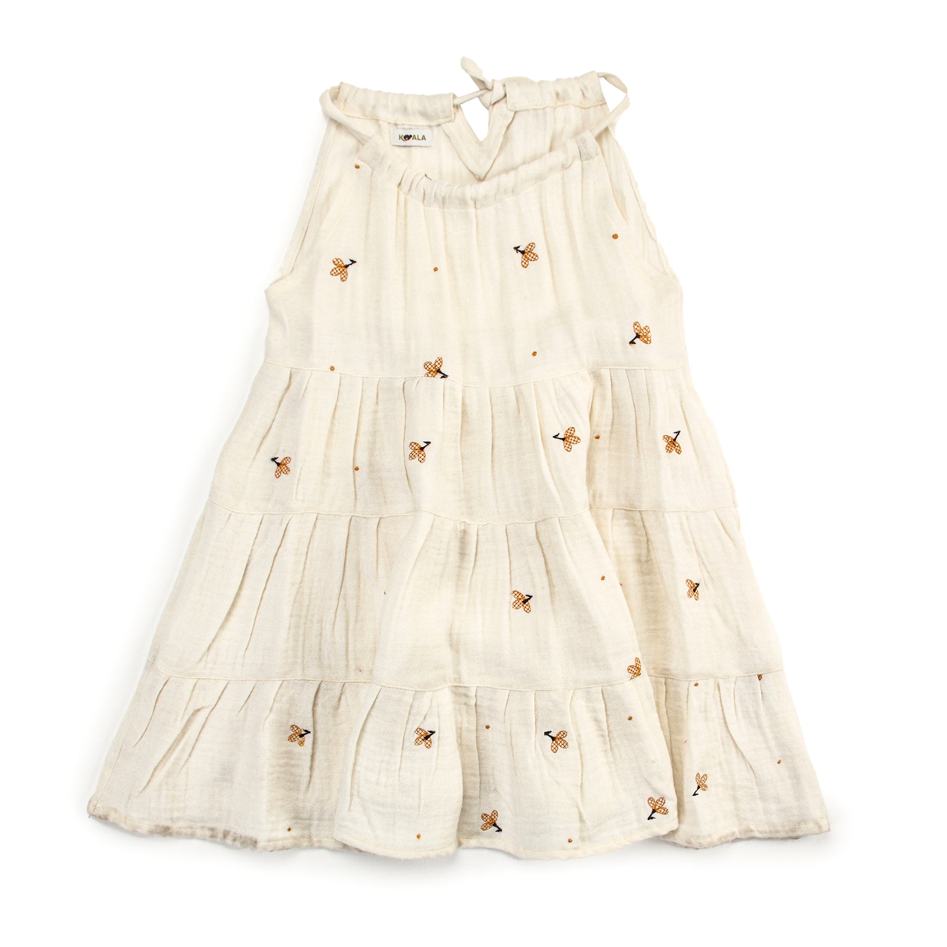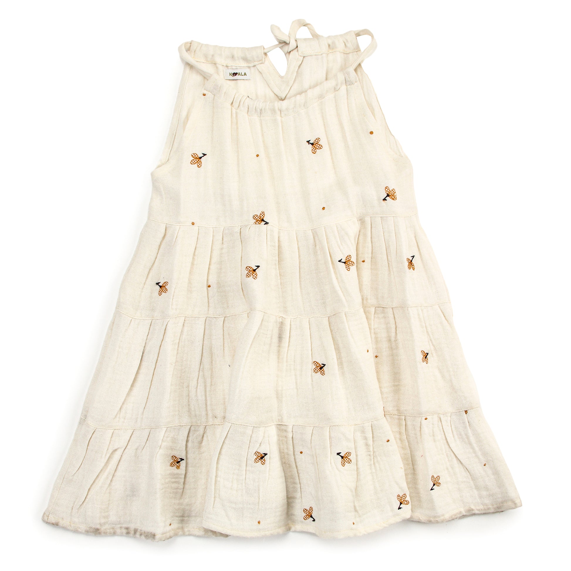 A-line embroidery sleeveless dress Rope-tie neckline Honeycomb design embroidery Tiered gathers details Knee length in flared hem Fabric – 100% organic cotton.
